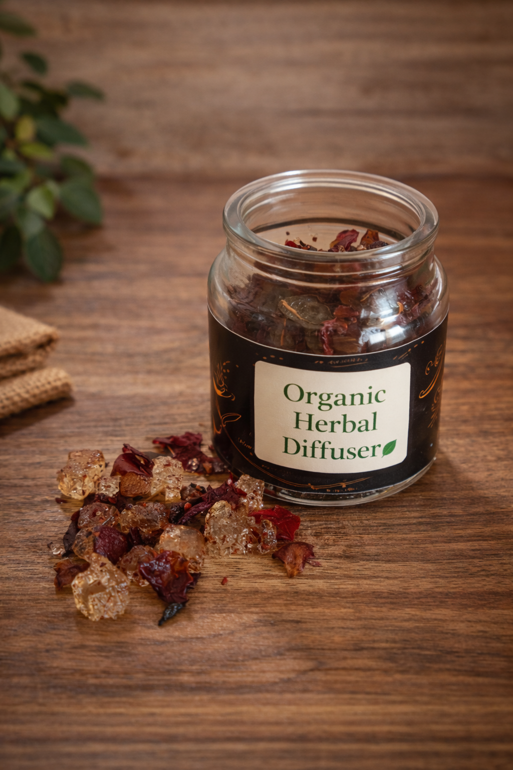 The herbal blend includes aromatic ingredients such as clove, cinnamon, and other natural botanicals, known for their purifying and therapeutic properties. When warmed in the diffuser, these ingredients release a warm, comforting fragrance that helps cleanse the air, promote relaxation, and uplift the mood.